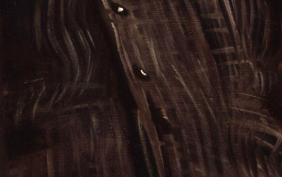 True to his style, there are no layered glazes requiring dry time between coats. Most of the brush strokes have been painted wet into wet, with just a few moves (such as the brow, and the shadow below the nose and the lip) look like they were wet into dry-ish. To see the speed of the painting, at least the way he wanted us to see it, look at the stripes on the vest. That was clearly done in one.