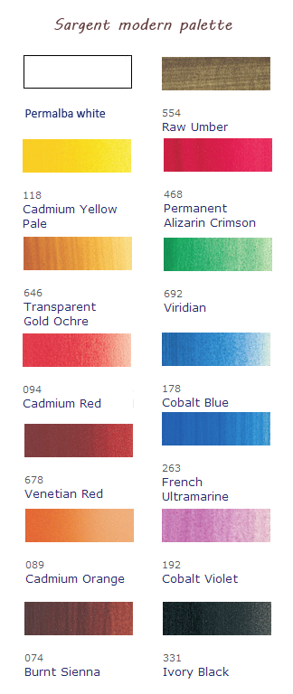 Honestly, a search for Sargent's list of pigments resulted in several websites definitively listing colors, and each list was different, so who knows. He likely shifted a few pigments over the years, but here's my best guess given my smidgeon of knowledge with historical pigments, and this Wiki pic: